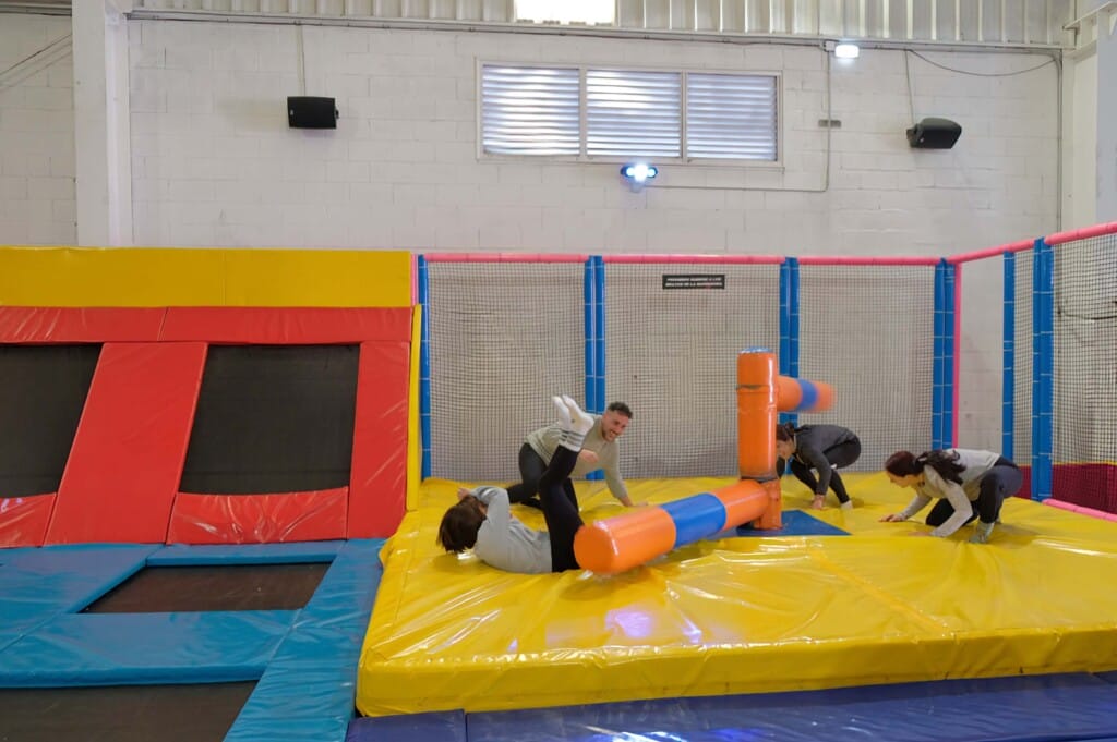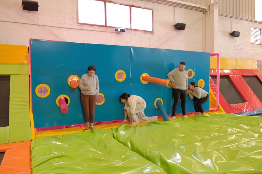 El circuito está formado por 7 pruebas: barredora, bolos humanos, lucha de sumo, lucha de gladiadores, pared de puños, futbolín humano y camas elásticas. Algunas son más físicas, otras más tácticas y otras están pensadas directamente para hacer reír, así que el grupo lo pasa bien con independencia de su condición física.